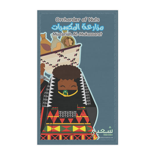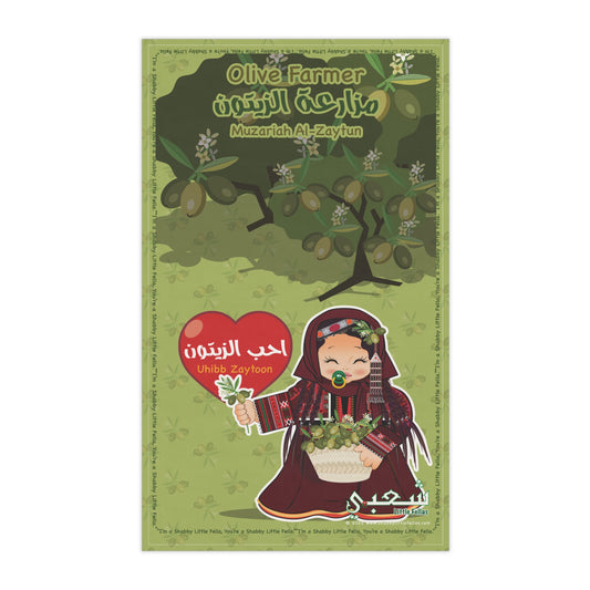 Olive Farmer's Tea Towel with Kawaii Northern Arabian Girl Muzari Al-zaytun scripted in Arabic