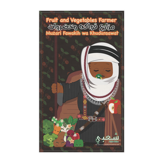 Fruit & Vegetable Farmer's Tea Towel with Kawaii Northern Arabian Farmer, scripted in Arabic